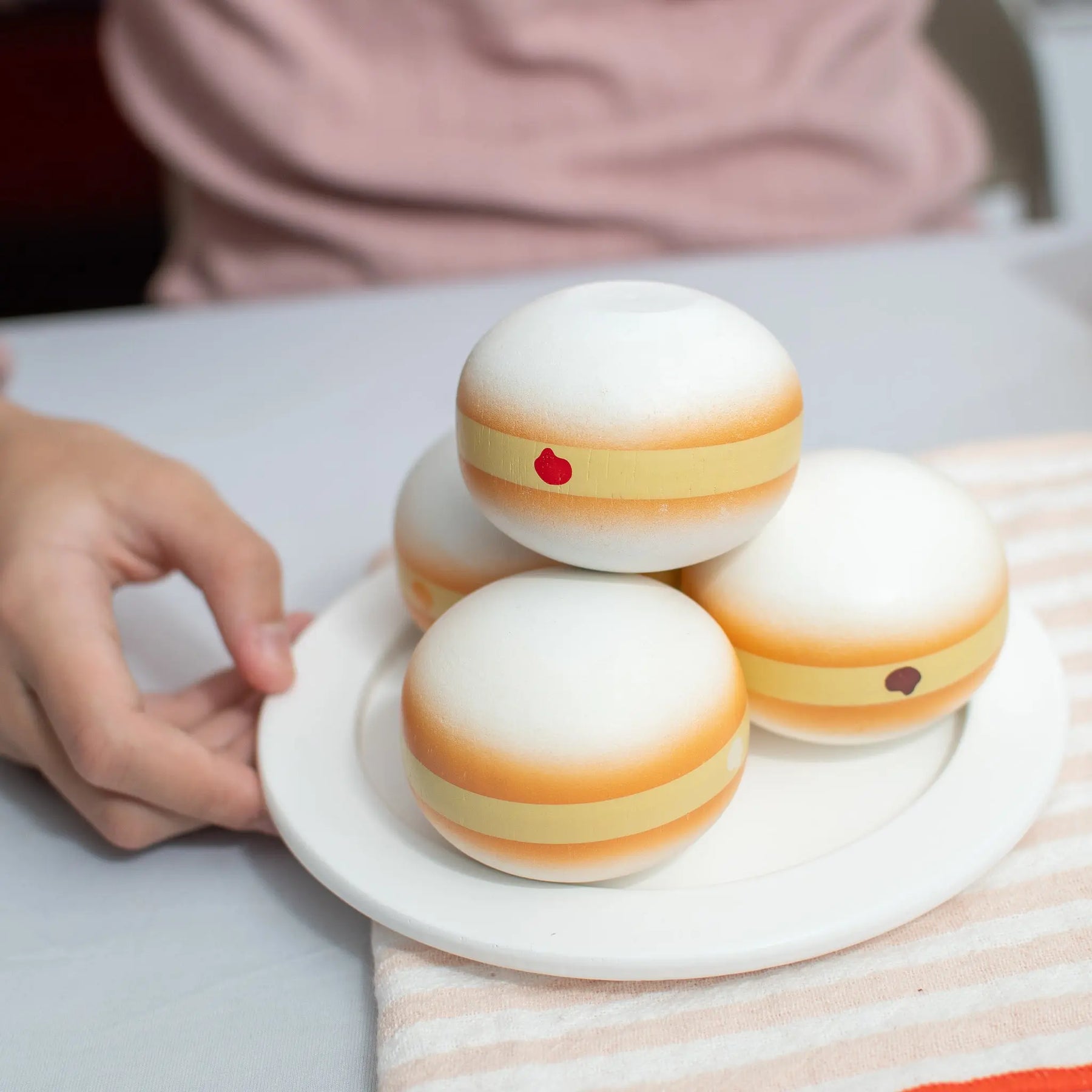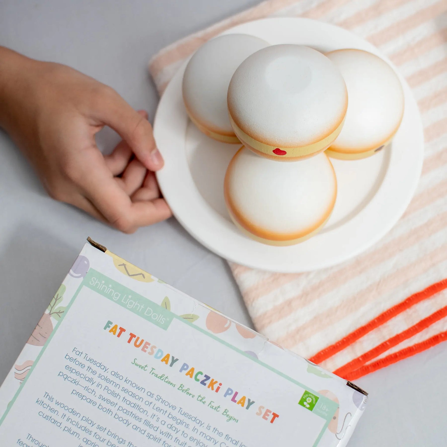 Fat Tuesday, also known as Shrove Tuesday, is the final joyful feast before the solemn season of Lent begins. In many Catholic homes, especially in Polish tradition, it’s a day to enjoy special treats like pączki—rich, sweet pastries filled with fruit or cream—as a way to prepare both body and spirit for the fasting to come.This wooden play set brings that flavorful tradition to life in the play kitchen. It includes four beautifully crafted pączki in classic “flavors”: custard, plum, apricot, and strawberry. A white wooden plate is included for serving and stacking.Through hands-on play, children can experience the rhythm of feasting and fasting, discovering the joy of Catholic traditions and the beauty of living the liturgical year—even before they’re old enough to fast themselves.