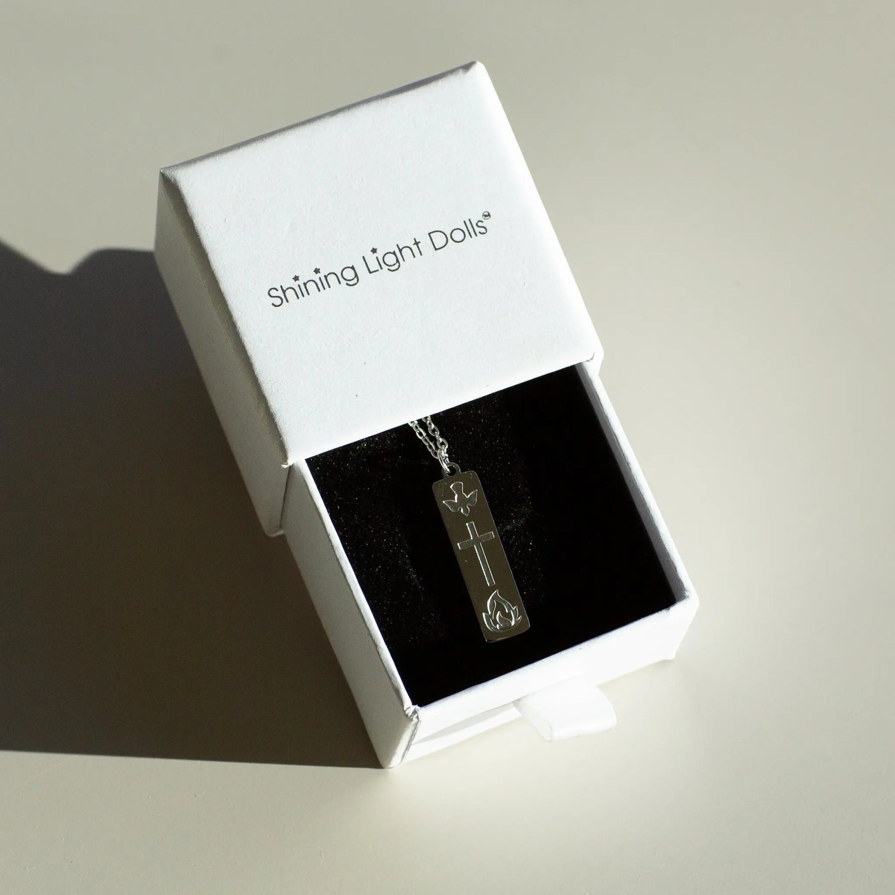 The necklace comes on an adjustable 45 + 5 cm / 17.7 + 2 in chain and is presented in a keepsake box with silver-stamped logo — a meaningful gift for Confirmation, Pentecost, or anyone seeking a daily reminder of God’s presence.