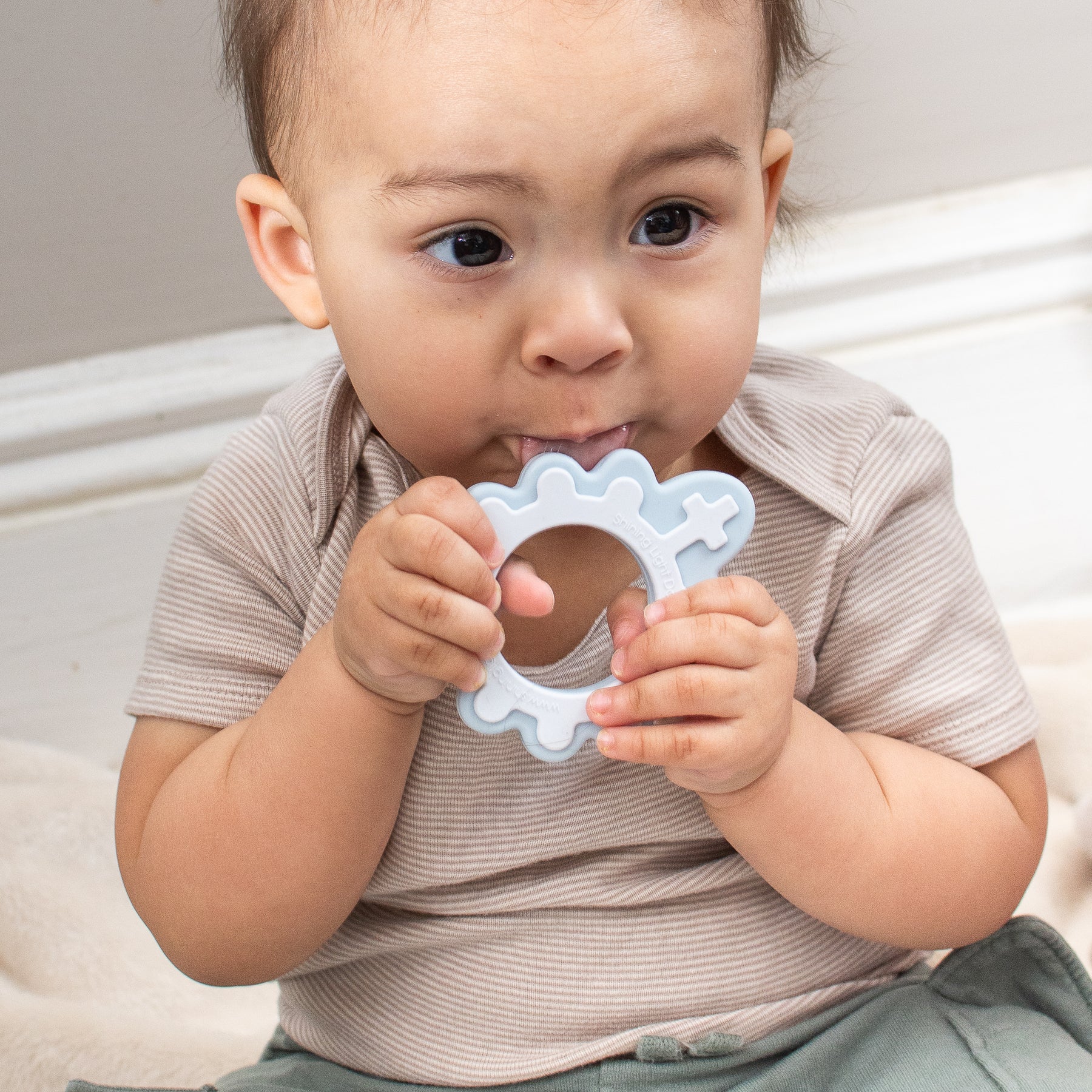 Mientras al bebé le están saliendo los dientes activamente, examine cuidadosamente el mordedor antes de cada uso. No lo deje expuesto a la luz solar directa y fuerte y manténgalo alejado de fuentes de calor. Conserve el embalaje para obtener información importante. Este producto contiene látex natural, que puede provocar reacciones alérgicas. Retire todos los embalajes y ataduras antes de su uso. Siempre supervise al niño durante el uso.